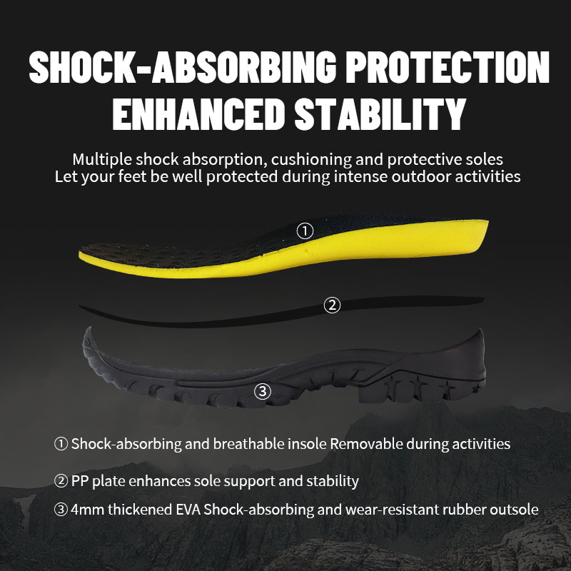 ①কুশনযুক্ত, শ্বাস-প্রশ্বাসযোগ্য ইনসোল—আপনি যখন এটি পরিষ্কার বা অদলবদল করতে চান তখন অপসারণযোগ্য। ②অতিরিক্ত পায়ের তলায় সমর্থনের জন্য একটি PP প্লেট দিয়ে শক্তিশালী করা হয়েছে—তাই প্রতিটি পদক্ষেপ শক্ত এবং নিয়ন্ত্রিত মনে হয়। ③4মিমি পুরু ইভা শক-শোষণকারী এবং পরিধান-প্রতিরোধী রাবার আউটসোল।