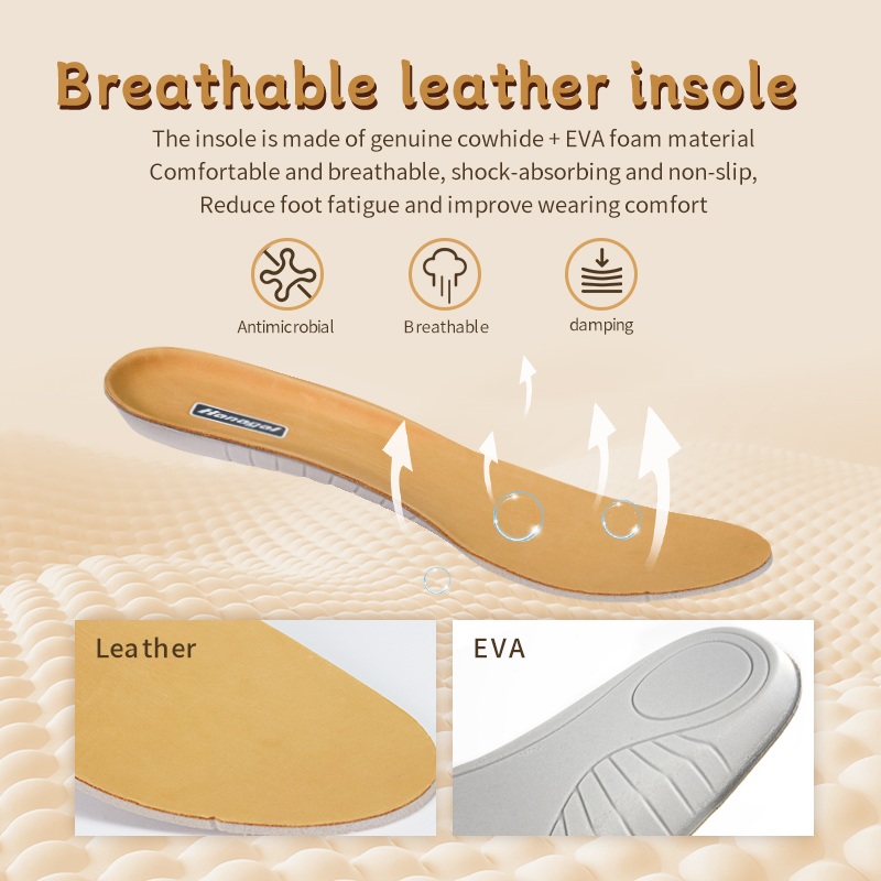 জেনুইন কাউহাইড + ইভা ফোম ইনসোল-শ্বাস নেওয়া যায়, শক-শোষক, এবং অ-স্লিপ। মাইলের পর মাইল পা সতেজ অনুভব করে।