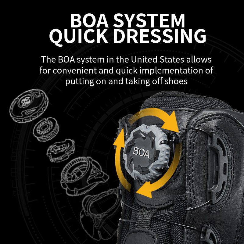 BOA সিস্টেমটি অন/অফ করে তোলে অনায়াসে: শক্ত করার জন্য একটি দ্রুত মোড়, মুক্তির জন্য একটি টান। কোন জরি নেই, কোন ঝামেলা নেই।