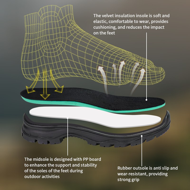 ①মখমলের আস্তরণ। পায়ের তলায় নরম। প্রভাব ভিজিয়ে দেয়। ②PP মিডসোল স্থিতিশীল সমর্থনের জন্য। ③রাবার আউটসোল যা যেতে দেয় না। আঁকড়ে ধরে, স্থায়ী হয়, নির্ভরযোগ্য থাকে।