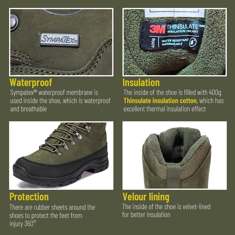 এই Sympatex ওয়াটারপ্রুফ ইনসুলেশন থিনসুলেট হান্টিং বুটগুলি 800 জোড়া MOQ সহ রঙ, উপকরণ এবং বিবরণে কাস্টমাইজ করার জন্য উপলব্ধ, ব্র্যান্ড সহযোগিতা এবং গ্রুপ সংগ্রহের জন্য আদর্শ। এবং এই শিকারের বুটগুলির নিম্নলিখিত সুবিধা রয়েছে: